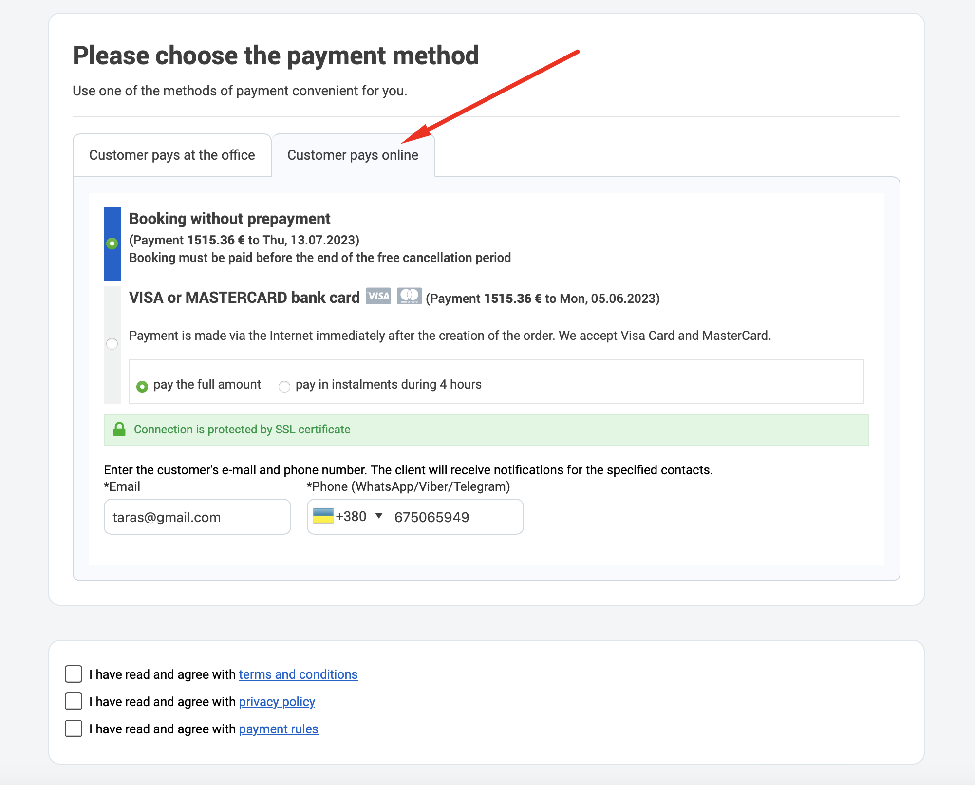 One of the payment methods, in which the tourist pays the gross amount (the commission is credited to the agency's office to the commission account). The payment system commission (acquiring) is not charged.